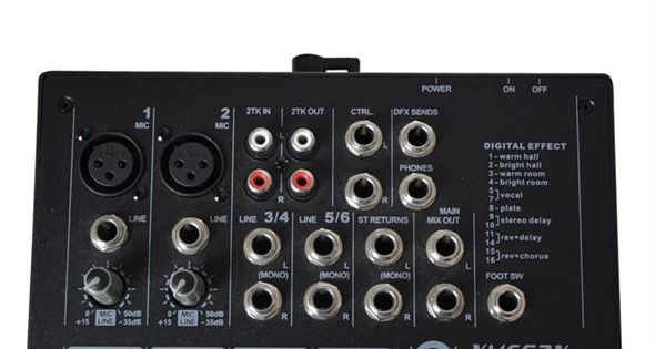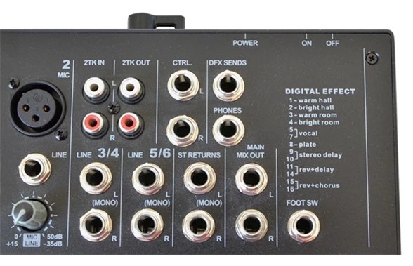 6-kanálový mixážní pult, 100 přednastavených 24-bit DSP efektů - mikrofonové předzesilovače s ultra nízkou úrovní šumu a +48V fantomovým napájením - extrémně velký dynamický rozsah - vstupní kanály pro mikrofon s XLR a vyváženými linkovými vstupy - 2 stereo vstupní kanály - 3-pásmový ekvalizér s LED diodami, znázorňujícími špičku pro mono kanály - 2-pásmový ekvalizér s LED diodami, znázorňujícími špičku pro stereo kanály - 1 AUX pro externí efekty a monitorování - 2 vstupy pro přiřazení písniček k hlavnímu mixu nebo ovládání místnosti / sluchátkových výstupů - symetrické TRS výstupy pro ovládání a sluchátka - 100 přednastavených 24-bit DSP efektů - velmi snadné ovládání Technické údaje: Mono kanály: - vstup pro mikrofon: XLR s vyvážením - frekvenční odezva: 10Hz – 55kHz, +/- 3dB - zkreslení (THD+N): < 0,03% při +0dB, 22Hz – 22kHz - rozsah zesílení: 0dB – 50dB - maximální vstup: +15dB - odstup signálu od šumu: < -100dB - fantomové napájení: +48V s ovládáním spínače - linkový vstup: 1/4“ s vyvážením - rozsah citlivosti: +15dB ~ -35dB Stereo vstupní kanály: - linkový vstup: 1/4“ nesymetrické audio - frekvenční odezva: 10Hz – 55kHz, +/- 3dB - zkreslení (THD+N): <0,03% při +0dB, 22Hz – 22kHz - maximální vstup: +22dB - odstup signálu od šumu: < -100dB Kanály EQ: Mono kanál: - vysoký: ± 15dB / 12kHz - střední: ± 15dB / 2.5kHz - nízký: ± 15dB / 80Hz Stereo kanál: - vysoký: ± 15dB / 12kHz - nízký: ± 15dB / 80Hz RCA Vstup: - TAPE IN: RCA jack - frekvenční odezva: 10Hz – 55kHz, +/- 3dB - zkreslení (THD+N): <0,03% při +0dB, 22Hz – 22kHz - rozsah zesílení: vypnuto až +10dB AUX výstupy - vstup: 1/4" nesymetrické audio - frekvenční odezva: 10Hz až 55kHz, +/- 3dB - zkreslení (THD+N): <0,03% při 0dB, 22Hz – 22kHz - rozsah zesílení: od vypnuto až +10dB - odstup signálu od šumu: < -100dB Impedance: - vstup pro mikrofon: 3,6 k? - všechny další vstupy: 10 k? nebo více - kazetový výstup: 1 k? - všechny další výstupy: 120 ? Hlavní mixážní sekce: - maximální MAIN MIX výstup: +22dB nesymetrické audio - AUX rozsah: vypnuto až +10dB - rozsah zesílení: vypnuto až +10dB - sluchátka / ovládání pro místnost: vypnuto až +15dB - šum / hluk: < -80dB při 0dB 20Hz – 22kHz, 1 kanál a hlavní úroveň: 0dB, ostatní: minimum - Crosstalk: < -80dB při 0dB 20Hz – 22kHz, hlavní úroveň: 0dB, ostatní: minimum Napájení: - AC adaptér: 230V AC, 50/60Hz, 1000mA - normovaná spotřeba energie 17 W (plná zátěž) | |||||||||||||||||||||||||||||||